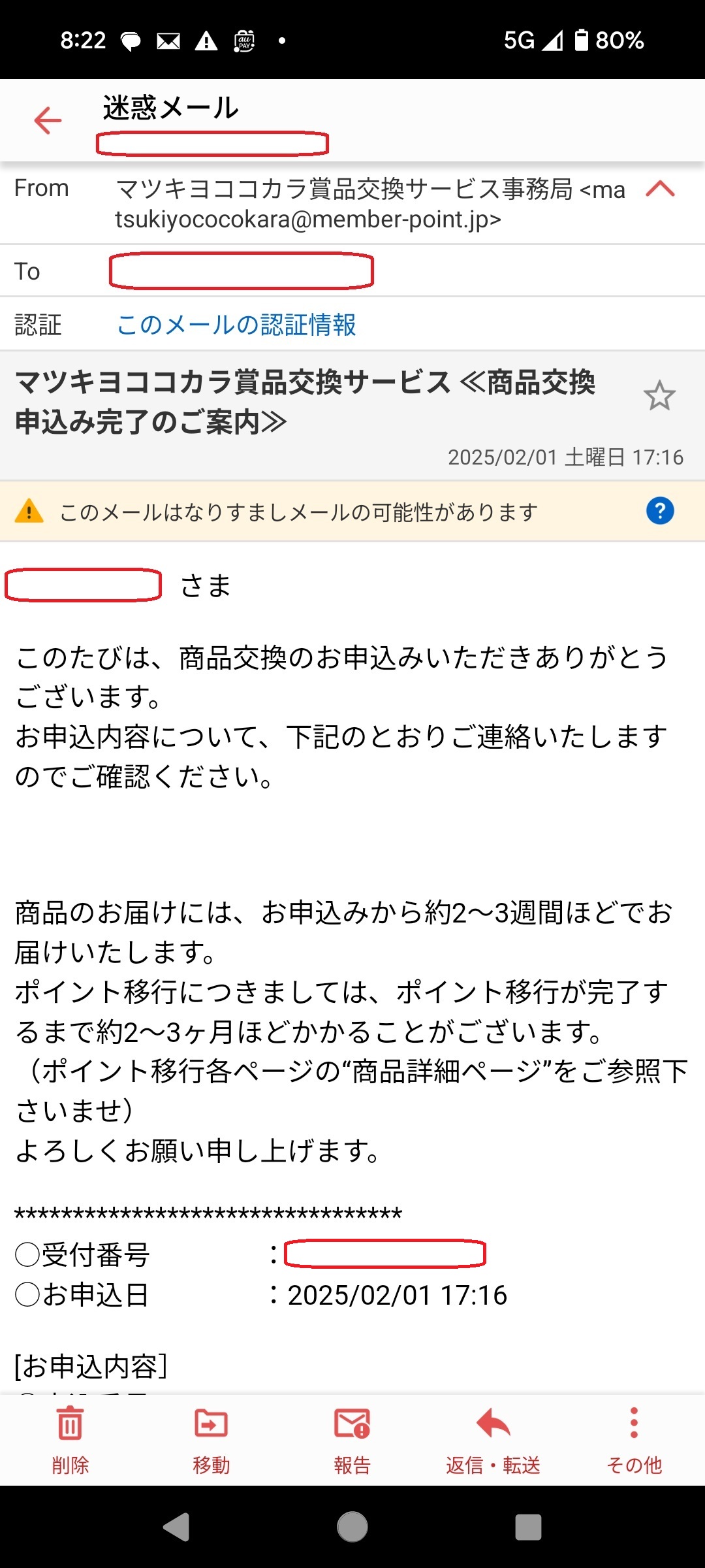 本メールは、私が以前にマツモトキヨシのアプリからポイント交換を行った後に届けられた