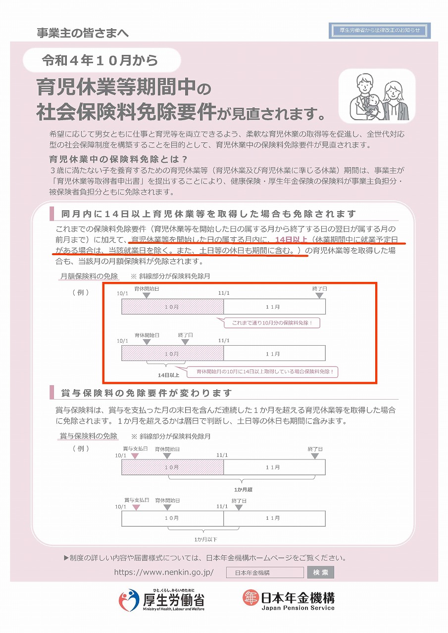 育児休業等を開始した日の属する月内に14日以上の育児休業等を取得した場合当該月の社会保険料が免除されます。