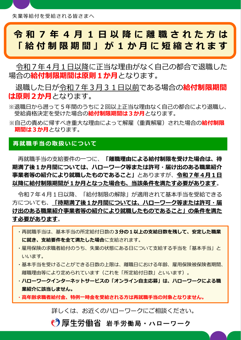 ※退職した日が令和7年3月31日迄の方は、受給手続きが4月1日以降でも「給付制限2カ月」ですのでご注意を。