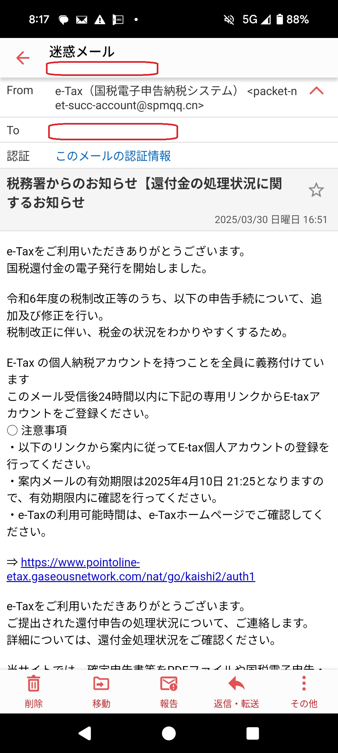 毎度のことながら、メールアドレス等で税務署とは関係ない所から送信されている事が明確なので、