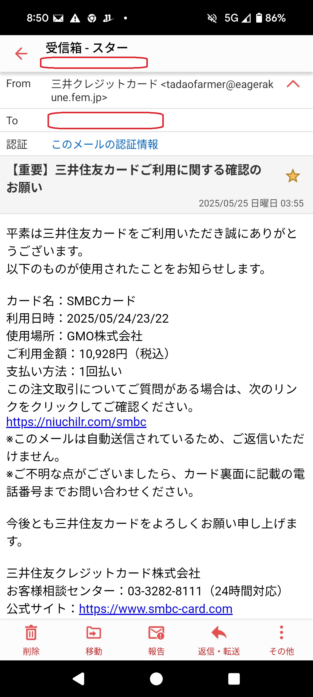 本メールは、三井住友カードから送られたと思わせる内容となっており、カード利用確認を
