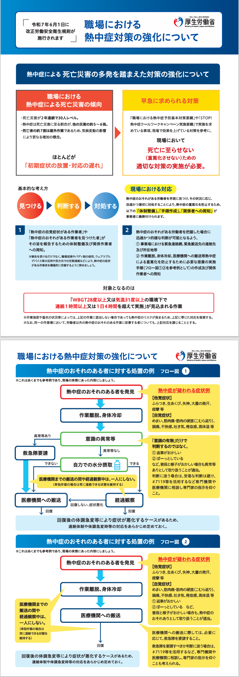 暑熱な場所に置いて連続して行われる作業など熱中症を生ずるおそれのある作業を行うとき、熱中症の重篤化を防止するため「体制整備」「手順作成」「関係者への周知」が事業者に義務付けられています。