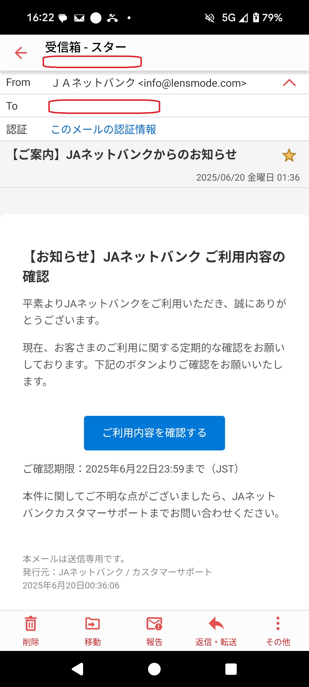 本メールは、JAネットバンクからの利用内容確認を装ったものとなっており、確認期限を