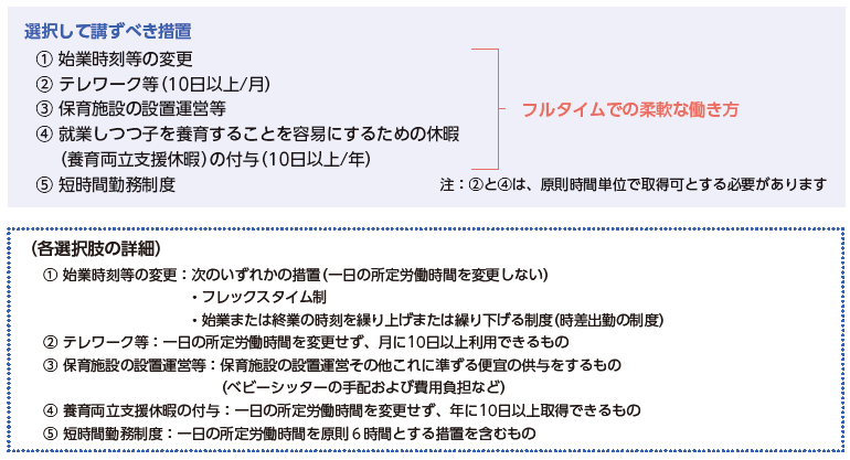 具体的には、「始業時刻等の変更」「テレワーク」「保育施設の設置運営等」「新たな休暇制度(養育両立支援休暇)の付与」「短時間勤務制度」の5つの選択肢の中から、2つ以上の制度を設けなければなりません。