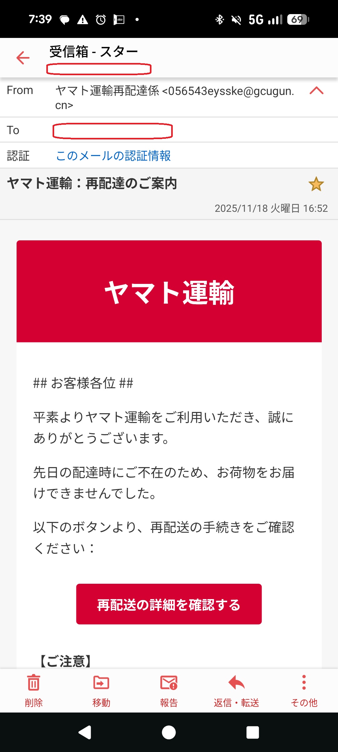 本メールは、大手配送会社であるクロネコヤマトからの、荷物再発送の案内だと