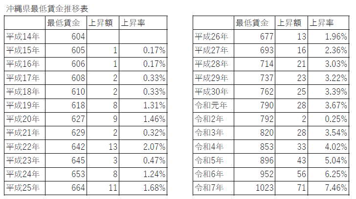 沖縄県の最低賃金の推移表 平成14年から令和7年まで