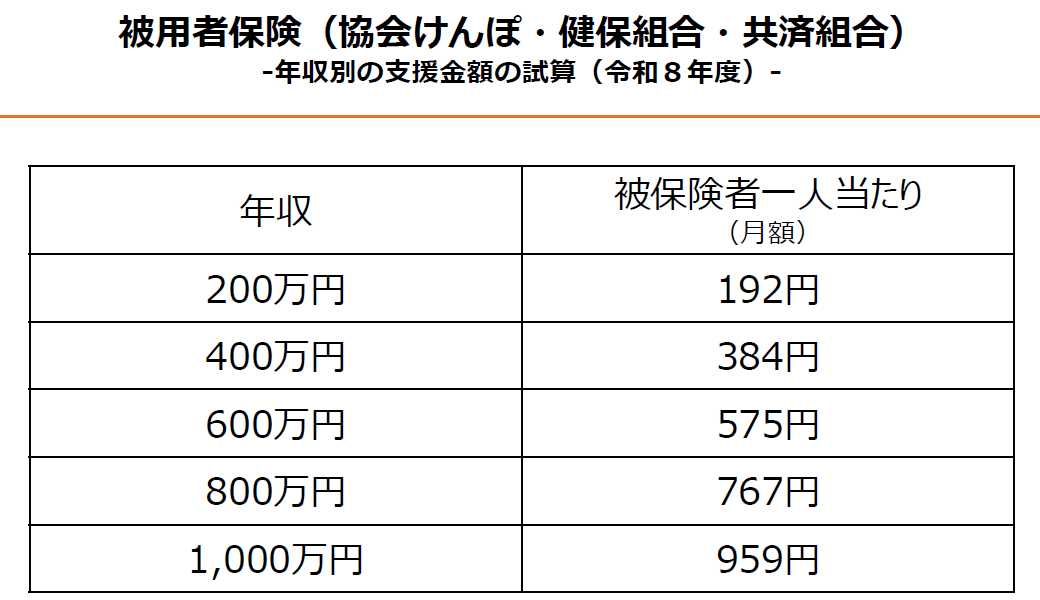 政府が公表している令和8年度の被用者保険(協会けんぽ・健保組合・共済組合)における試算では、年収によって負担額が異なります。