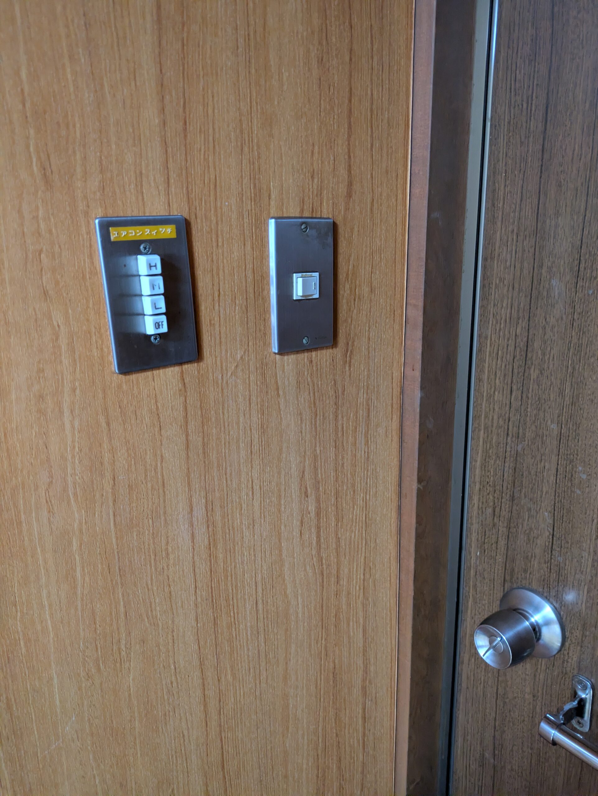 昭和を感じる関西のビジネスホテルのエアコンスイッチ。ボタンを押す感触が素晴らしかったです。