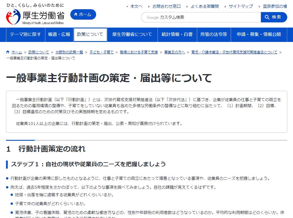 一般事業主行動計画(以下「行動計画」)とは、次世代育成支援対策推進法(以下「次世代法」)に基づき、企業が従業員の仕事と子育ての両立を図るための雇用環境の整備や、子育てをしていない従業員も含めた多様な労働条件の整備などに取り組むに当たって、以下の事項を定めるものです。
