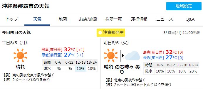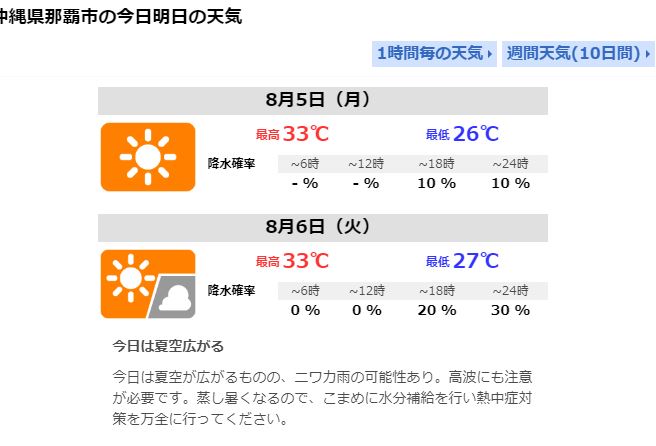 一例として、2つの天気予報サイトにて、8/5(月)の15:00時頃に検索した、8/6(火)の那覇市の天気予報を比較してみましょう。
