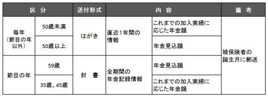 ねんきん定期便は下記の表のように節目の年や、年齢によって送付形式や内容に違いがあります。