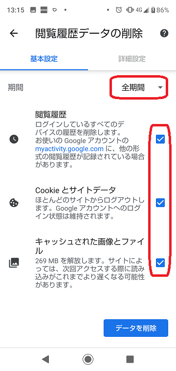 IV. 期間を『全期間』に切り替えた上で、『閲覧履歴』『Cookieとサイトデータ』『キャッシュされた画像とファイル』にチェックを入れて『データを削除』をタップする。