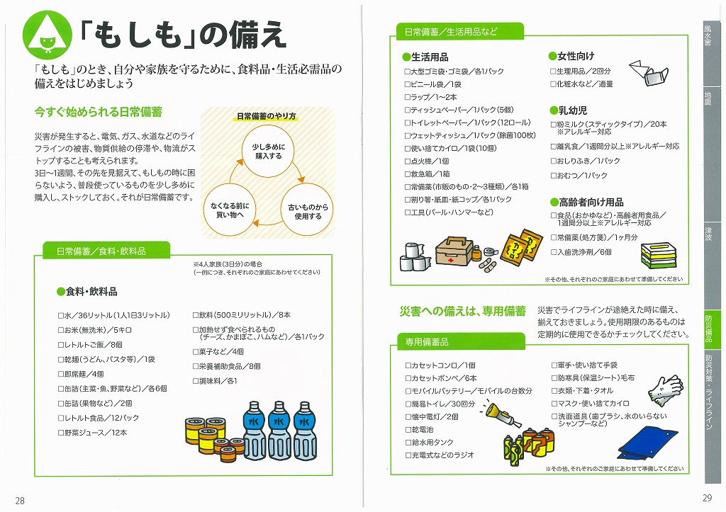 「もしも」のとき、自分や家族を守るために、食料品・生活必需品の備えをはじめましょう。