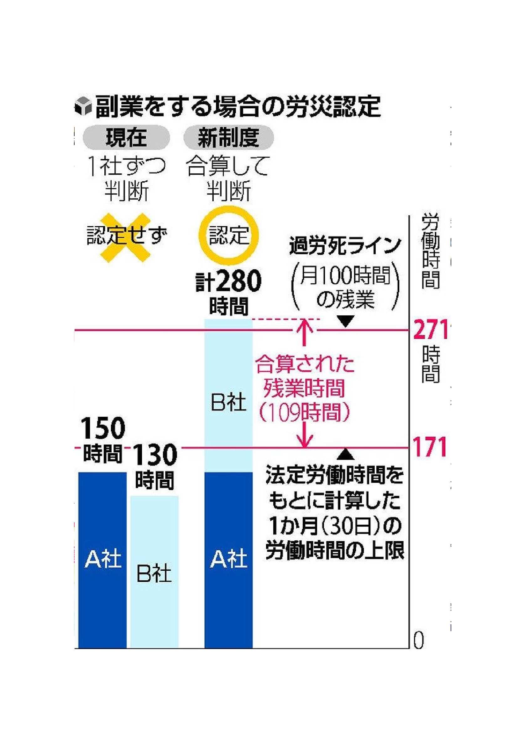 新制度では、本業と副業の総労働時間のうち、法定時間より多く働いた時間(残業時間)が過労死ラインを超えれば、労災認定につながります。