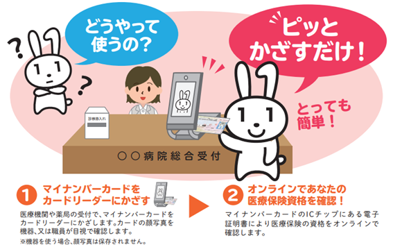 公開されたリーフレットによると、病院の窓口でマイナンバーカードを「ピッ!」と端末にかざすだけで健康保険証代わりに使用できるというものです。