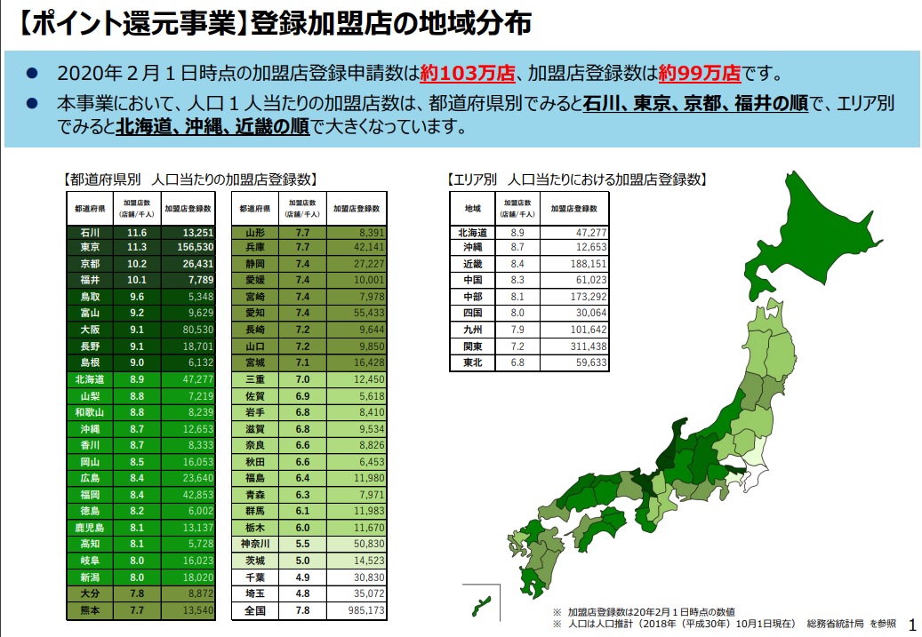 2020/2/1時点での、加盟店登録申請数は約103万店舗、登録加盟店数は約99万店となっているようです。