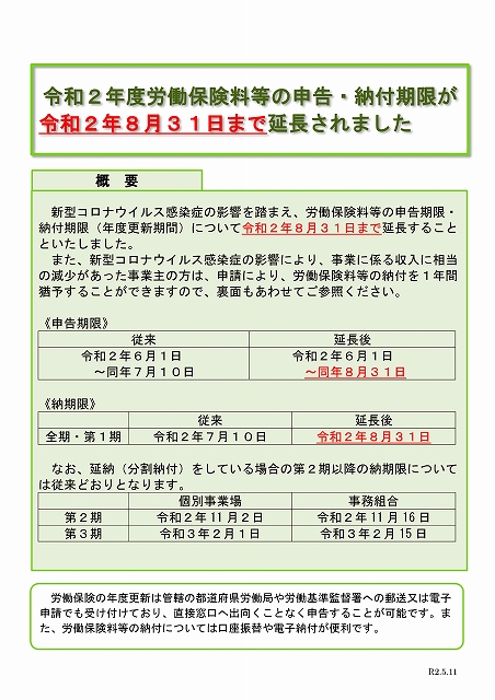 事業主の皆様におかれては、令和2年度の労働保険料及び一般拠出金の概算保険料及び確定保険料に係る申告書の提出及び納付は、令和2年8月31日までにお願いします。(参考1表面及び参考2)。