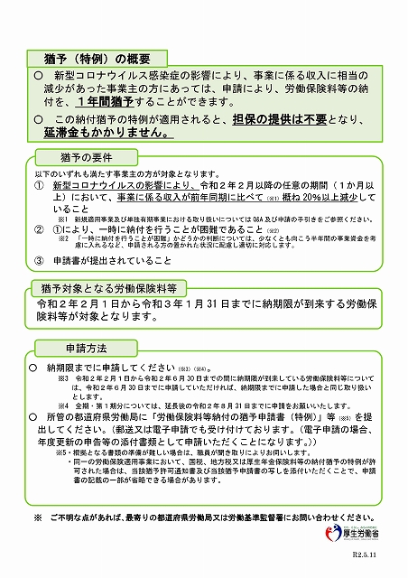 新型コロナウイルス感染症の影響により、事業に係る収入に相当の減少があった事業主の方におかれては、申請により労働保険料等の納付を1年間猶予することができます(労働保険料等の納付猶予の特例)
