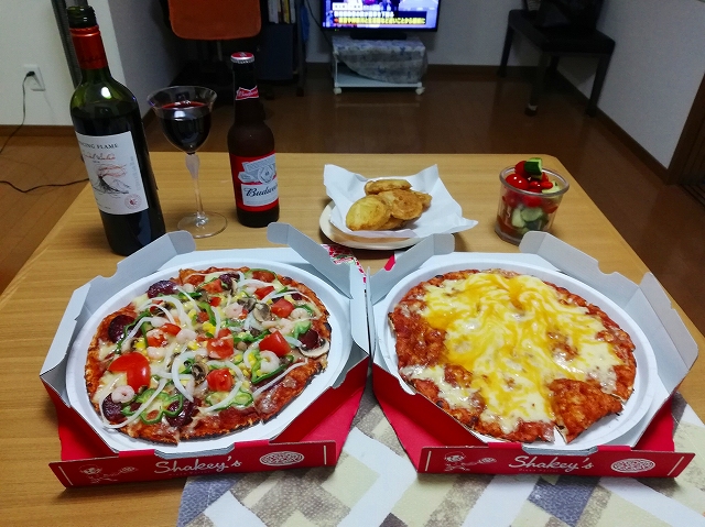 メルカリで購入したワイングラスとテイクアウトピザで家呑み楽しんでいます(^_-)-☆