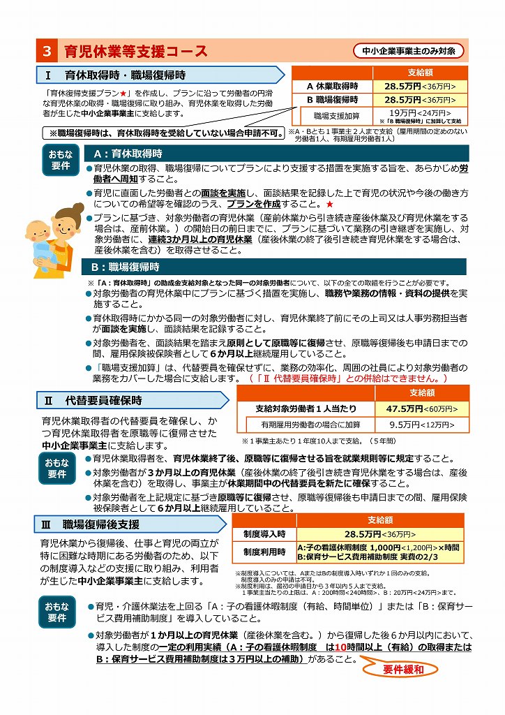 そこで、国は出産後も働くことが出来る環境作りを行う事業所に助成金を支給しています。
