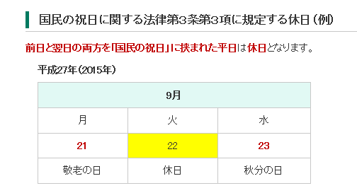 前日及び翌日が「国民の祝日」である日(「国民の祝日」でない日に限る。)は、休日とするという条項があるようです。