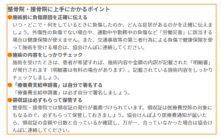 詳しくはこちら⇒ 知っトク!医療保険情報 「整骨院・整骨院にかかるとき」
