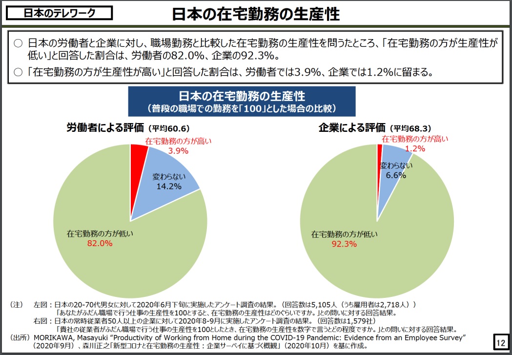 在宅勤務を導入する企業が増えても結果的に生産性は低くなったと、労働者、会社ともに考えているのが大半だということになりました。
