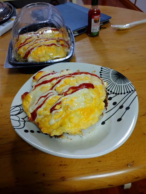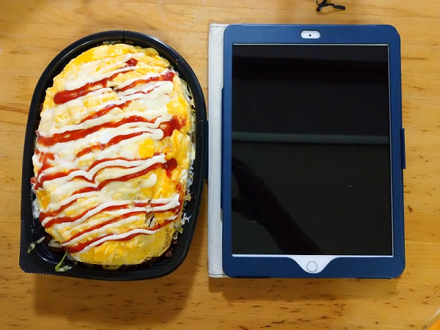 自宅の近所にある知る人ぞ知る大盛ランチの名店 ちゃつぼ。妻がオムタコライスをテイクアウトしてくれたのですが期待以上のボリューム、隣のiPadと比べて大きさが分かりますでしょうか。