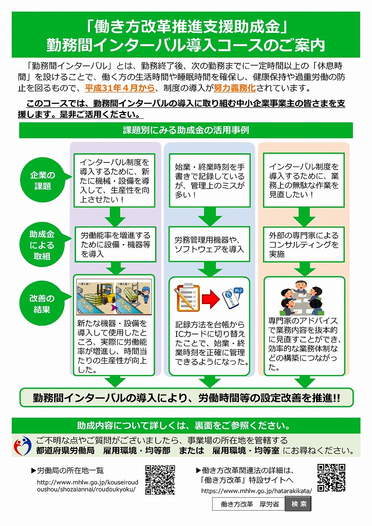 このコースでは、勤務間インターバル制度の導入に取り組む中小企業事業主の皆さまを支援します。