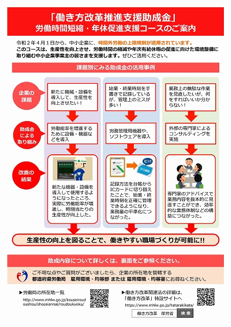 このコースは、生産性を向上させ、労働時間の縮減や年次有給休暇の促進に向けた環境整備に取り組む中小企業事業主の皆さまを支援します。