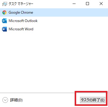 ③ 終了させる事が出来ないプログラム、アプリケーションを選択した後、右下の『タスクの終了』をクリックする。