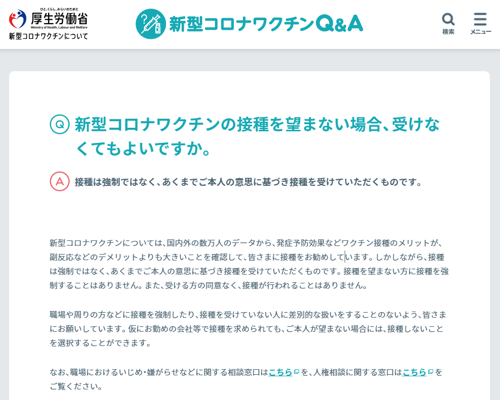 厚生労働省HP コロナワクチンQ&A 新型コロナワクチンの接種を望まない場合、受けなくてもよいですか。