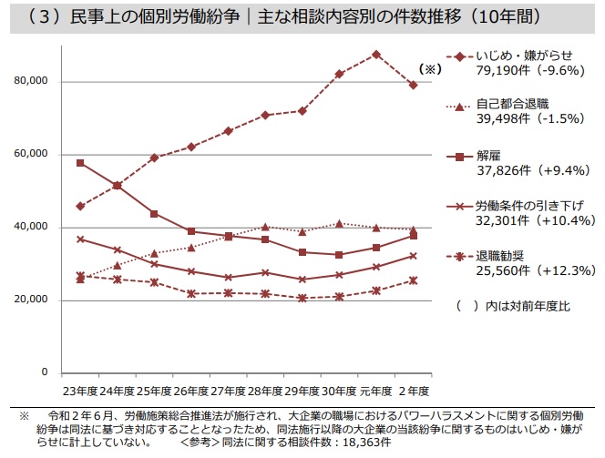 参考:「令和2年度個別労働紛争解決制度の施行状況」を公表します「いじめ・嫌がらせ」の件数が引き続き最多、「解雇」等に関する民事上の個別労働紛争が前年度より増加」