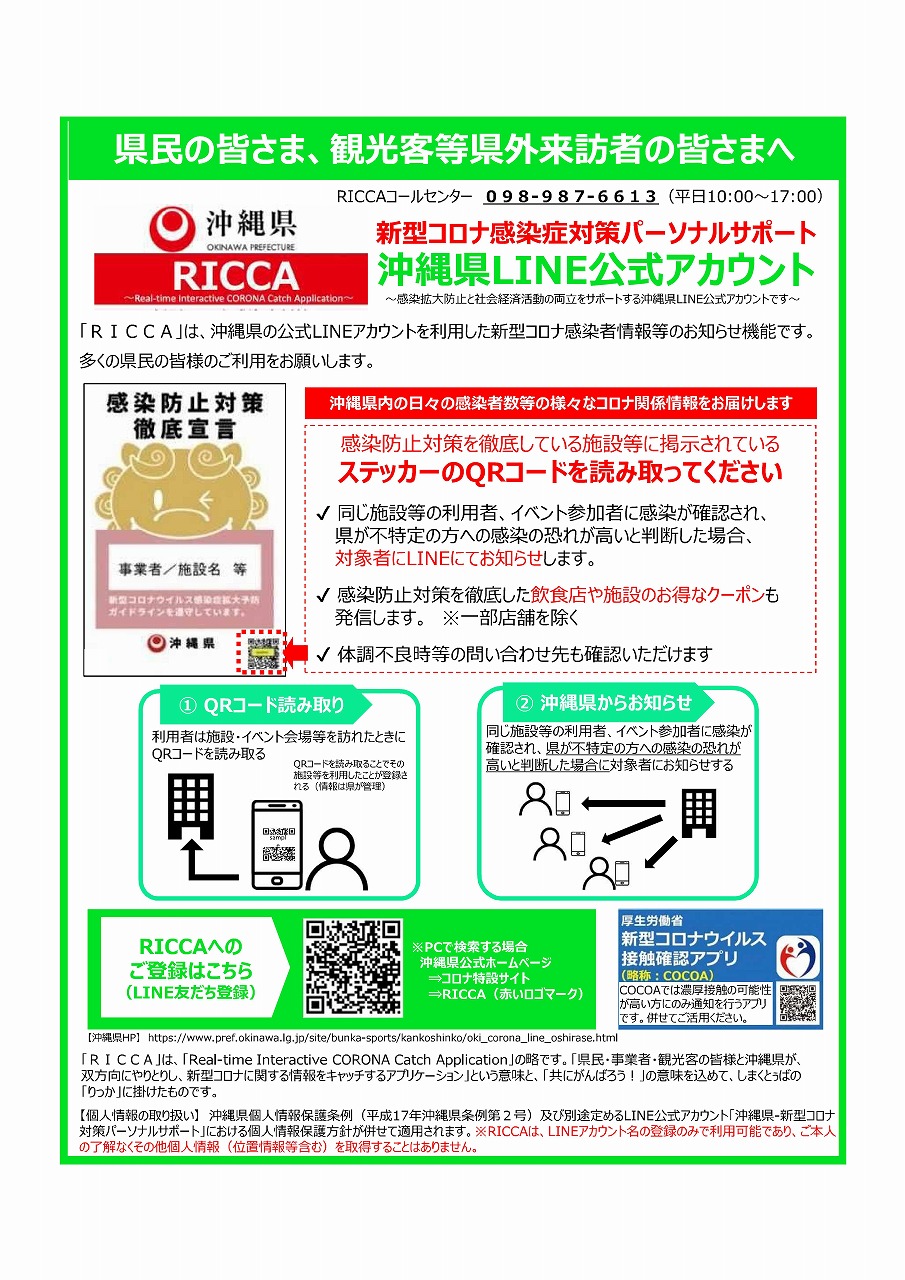 沖縄県では、感染拡大防止と社会経済活動の両立をサポートするため、LINE公式アカウント「沖縄県-新型コロナ対策パーソナルサポート」の新たな機能である「RICCA(リッカ)」の運用を10月16日から開始しました。