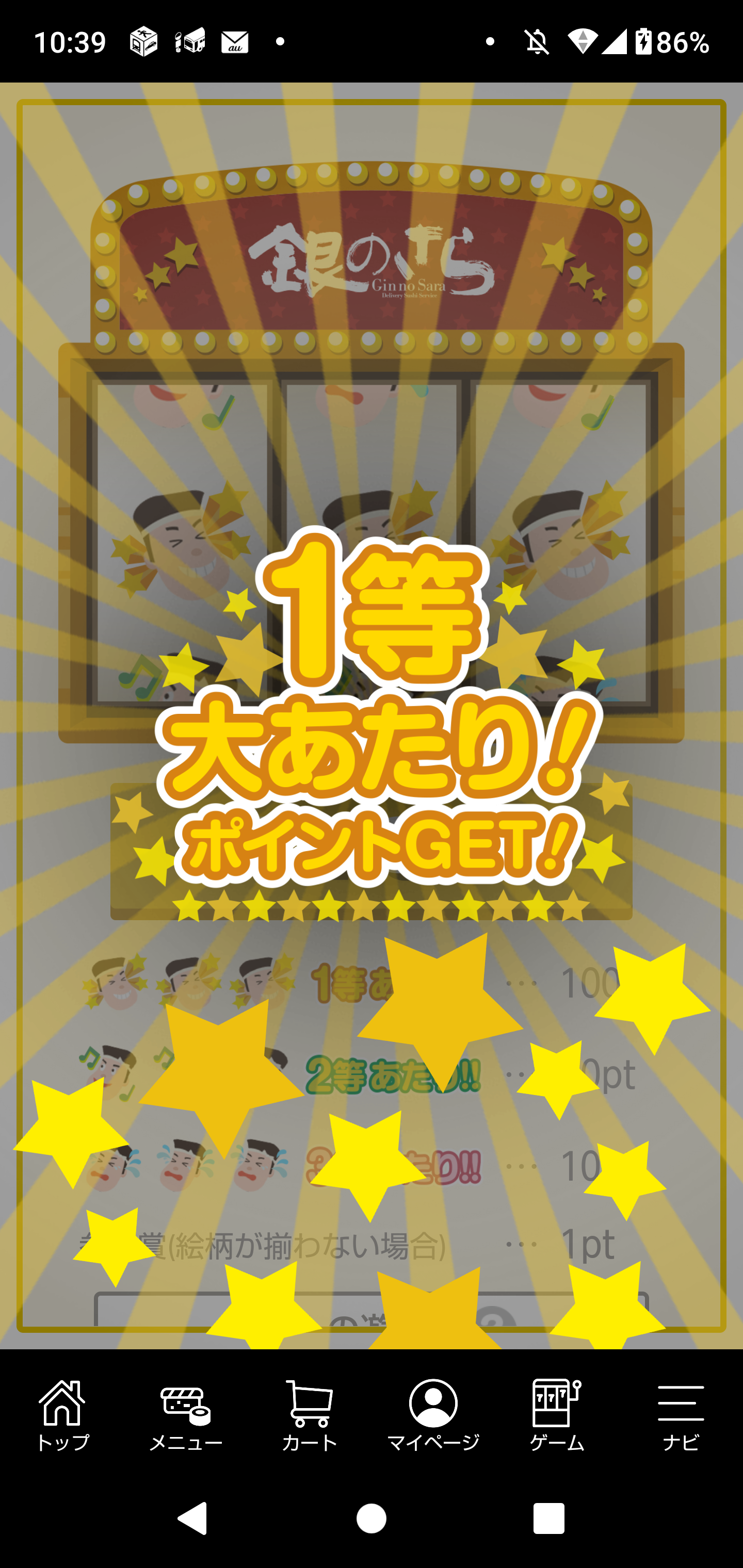 宅配寿司『銀のさら』アプリでのミニゲームをこまめに挑戦していましたが、初めて1等が出たのでスクリーンショット。ほとんどが参加賞、もしくは3等なので嬉しい限りです。ひょっとしたら年末ジャンボ宝くじも…?
