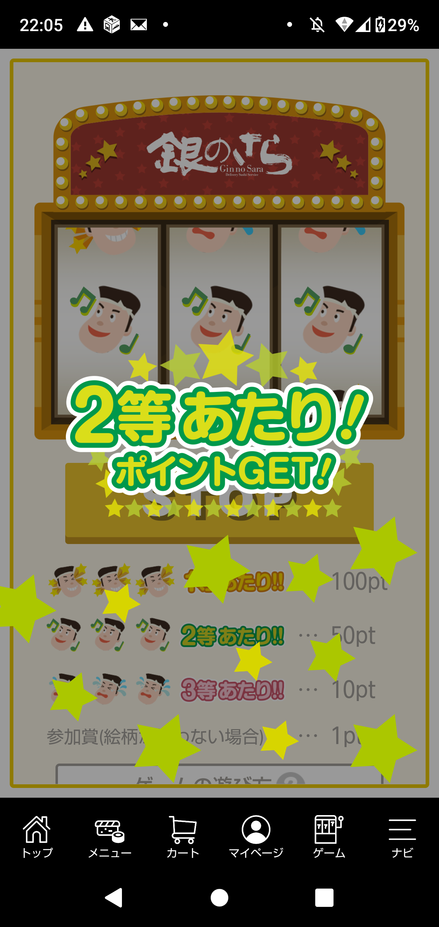宅配寿司『銀のさら』アプリでのミニゲームで前回の1等あたりに引き続き、2等あたりが出たのでスクリーンショット。今年はこれで完全に他のくじ運を使い切ってしまったかも?
