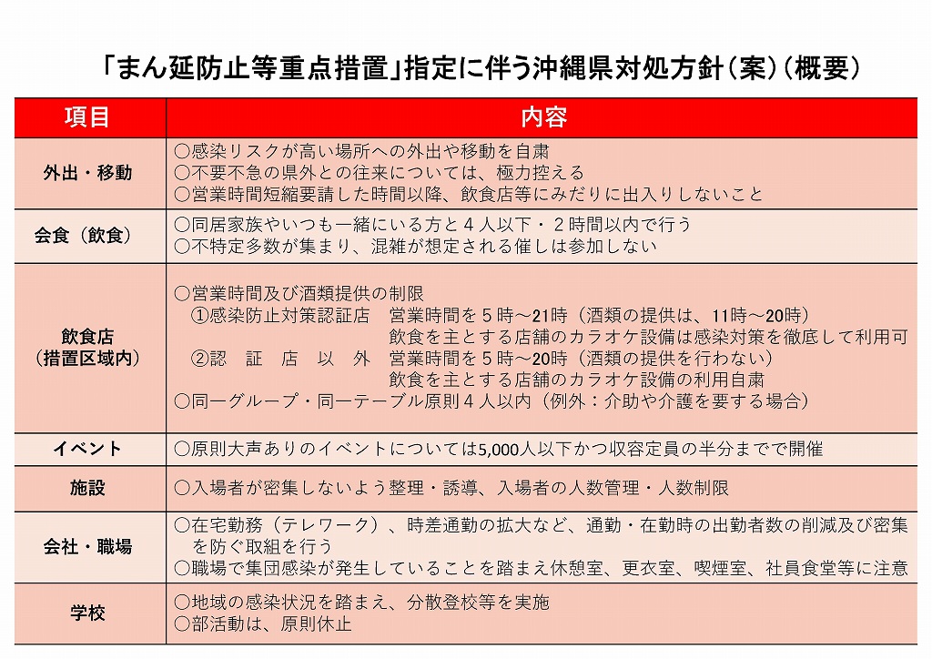 詳細についてはこちら→「まん延防止等重点措置」指定に伴う沖縄県対処方針(令和1月6日時点)