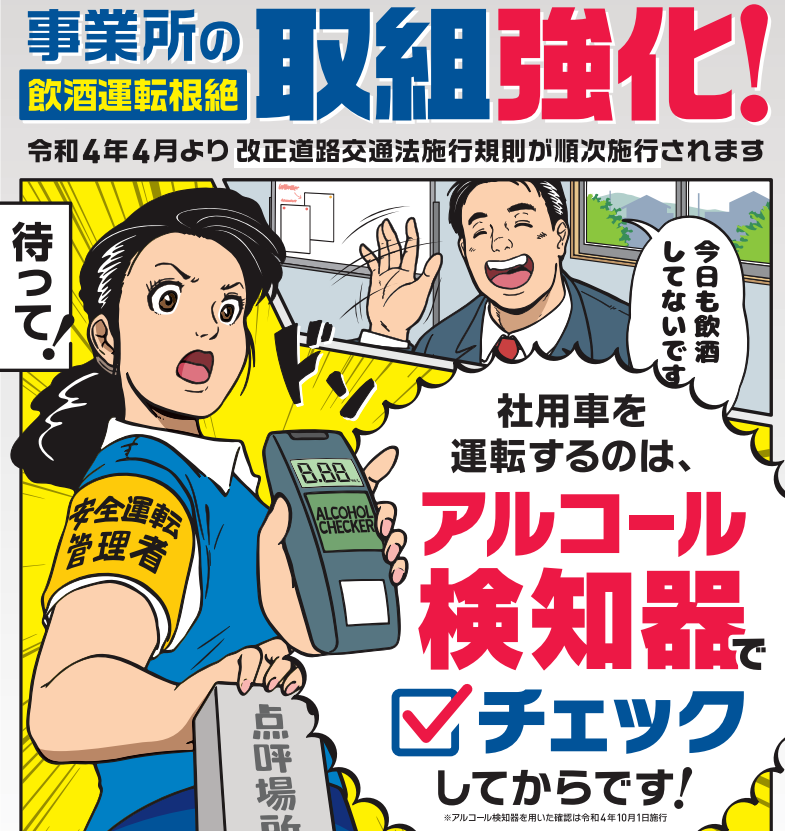 2022年10月からは、アルコール検知器を使ったアルコールチェックが義務化されます。