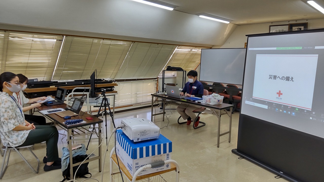先日なか事務所では沖縄赤十字社の方を招いて防災訓練を行いました。