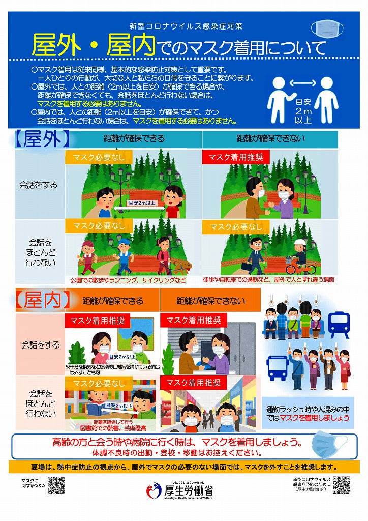 特に夏場については、熱中症予防の観点から、屋外でマスクの必要のない場面では、マスクを外すことを推奨します。