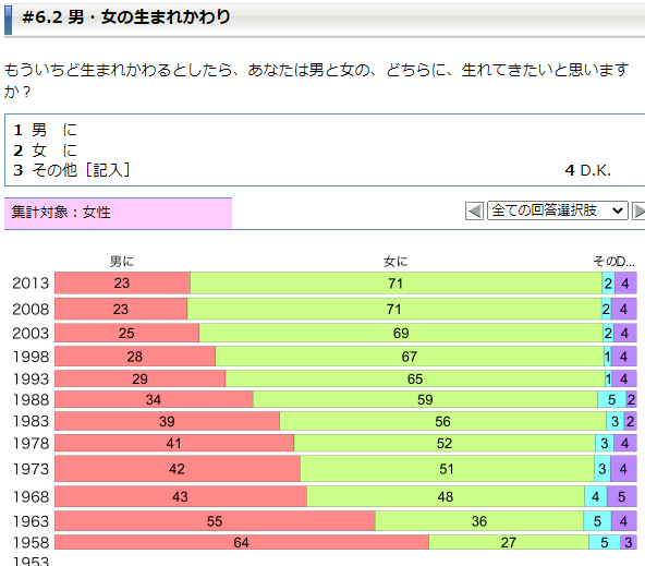 しかし、女性の7割以上が生まれ変わっても「女性」として生まれてきたいと回答した結果があるということです。
