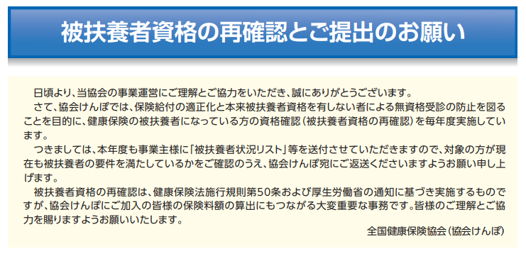 令和4年(2022年)も協会けんぽから、保険給付の適正化と本来被扶養者資格を有しない者による無資格受診の防止を図るという目的で、健康保険の被扶養者になっている方の資格確認(被扶養者資格の再確認)のための案内が送付されています。