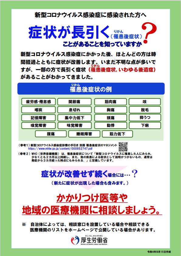 新型コロナウイルス感染症の罹患後症状(いわゆる後遺症)は、他に原因が明らかではなく、体調不良が続く、もしくはその後に何らかの体調不良が出現する等、色々な症状の全般のようです。