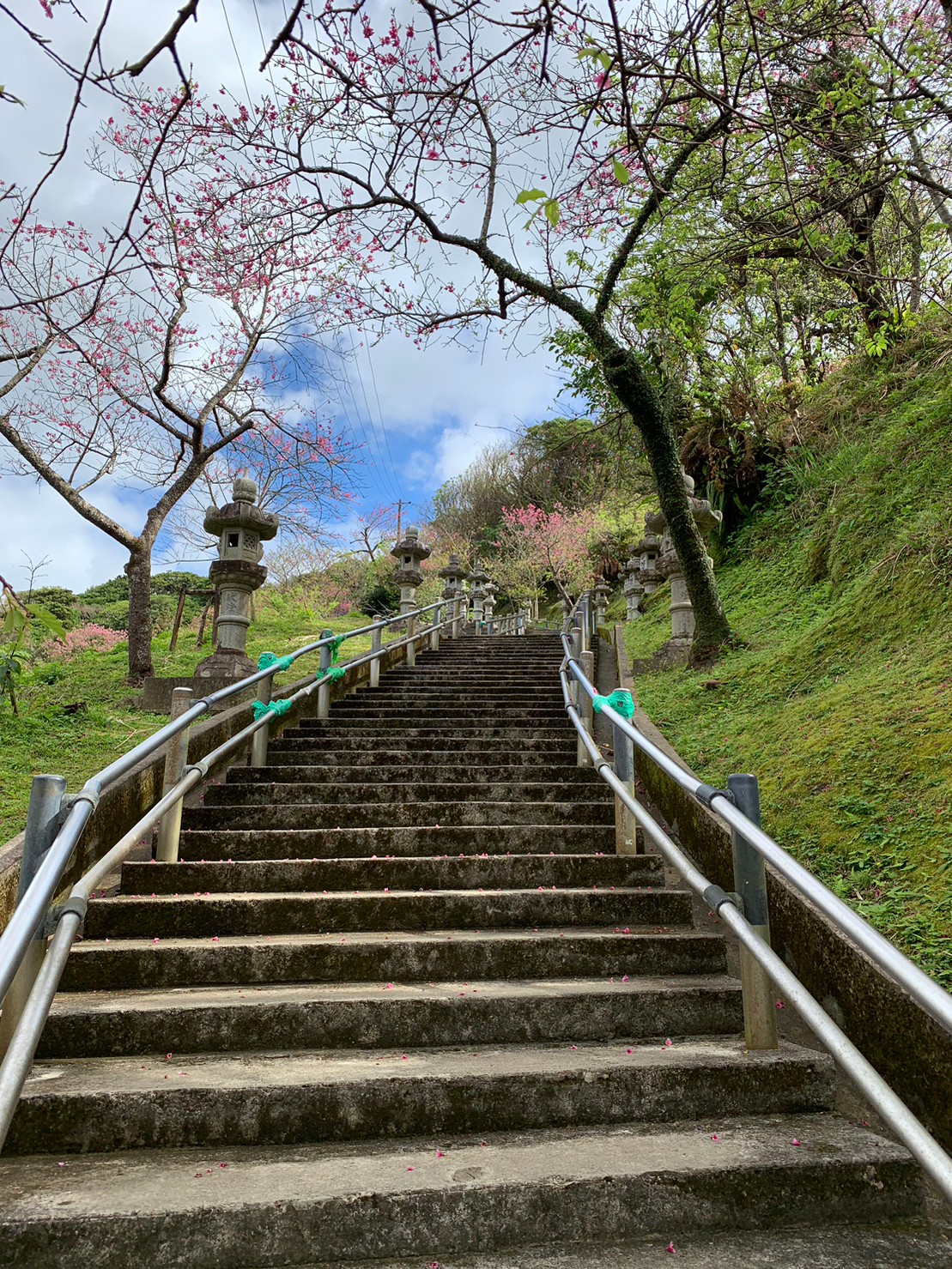 この間、名護城址に行き、いつまでも続く階段を登りました。青空をバックにした桜がきれいでした。