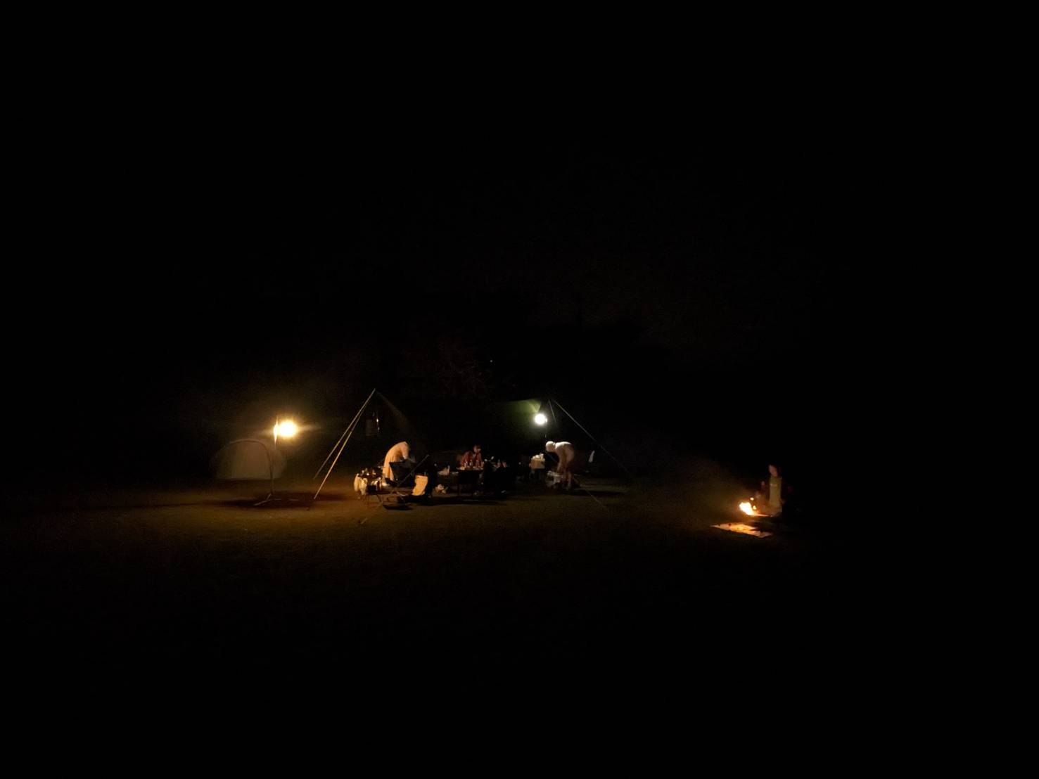 真っ暗闇のなか、ランタンとたき火が映えるキャンプ^^