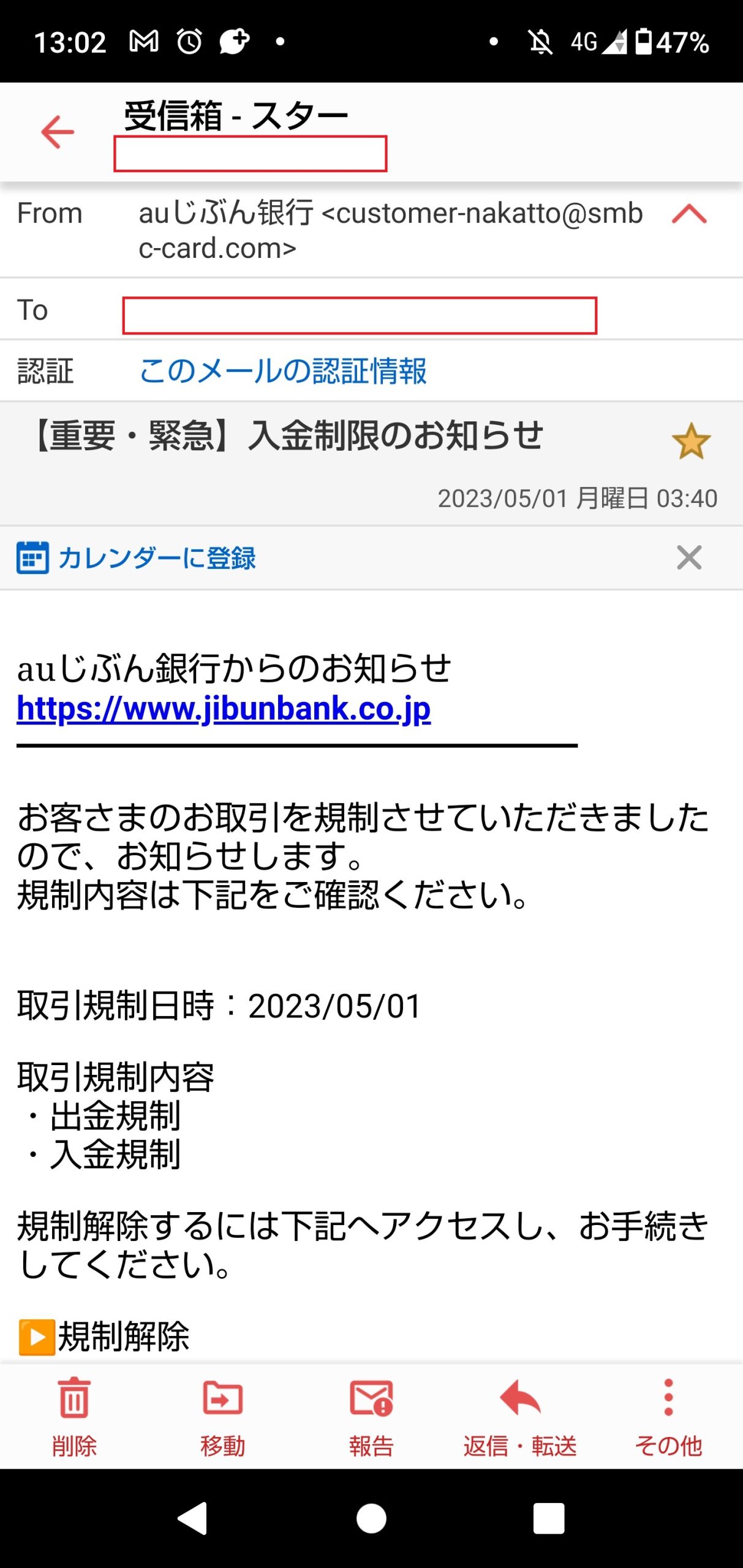 件名の『【重要・緊急】入金制限のお知らせ』というワードは定型化しているようなので、
