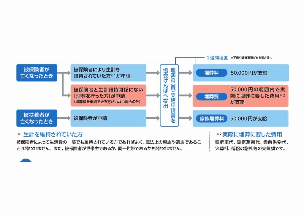 被保険者・被扶養者が業務外の事由により亡くなった場合、埋葬料(費)が支給されます。