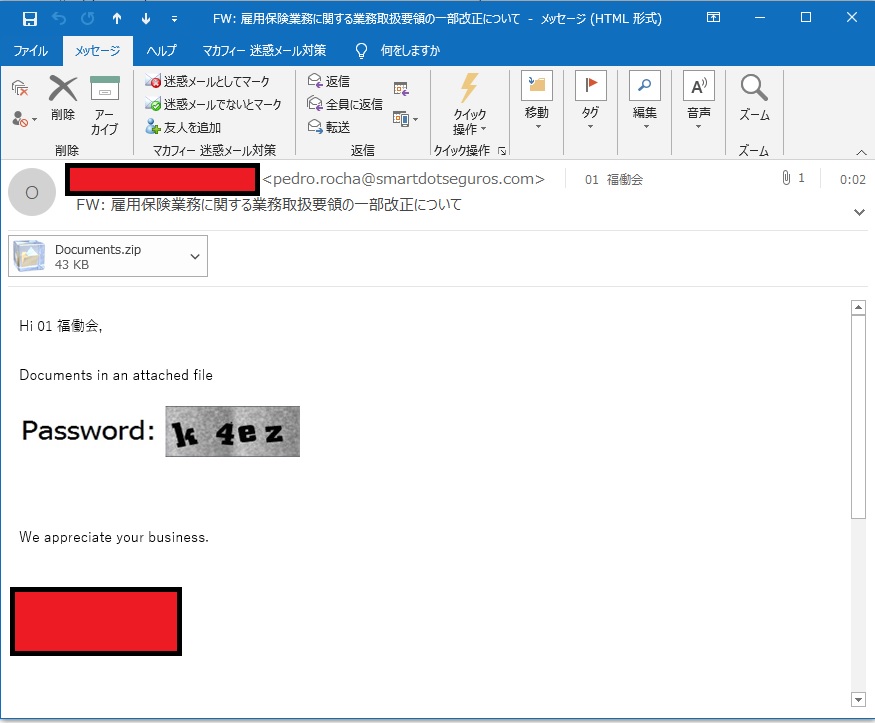 この見るからに怪しいメールも、スプーフィング攻撃につながる可能性があります。不用意に添付ファイルを開くのは、ダメ!