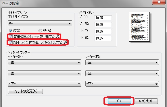 3.ページ設定にて、『背景の色とイメージを印刷する(C)』、『縮小して全体を表示できるようにする(S)』の左にあるチェックボックスへ、それぞれチェックを入れた後、『OK』を左クリック。