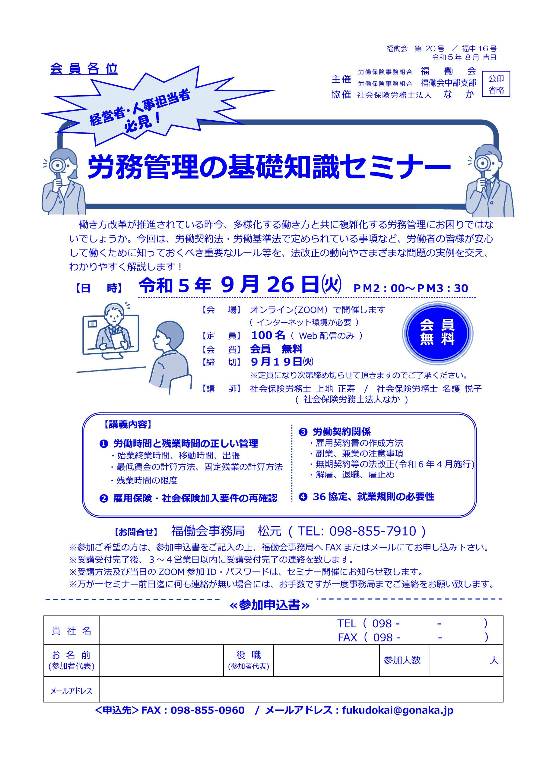 労務管理担当者の皆様、労務管理の基礎知識セミナー開催します。